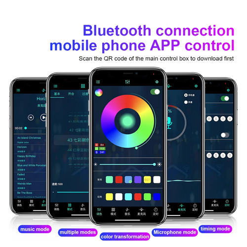 Download the application by the QR code on the main control box first, control light mode via Bluetooth connection. This product include 1 main control box ,4 sub control box. Each controller has a power cable, the main controller is connected to a 5-12V power supply under the stearing wheel, and the sub controller also needs to be connected to a 5- 12v power supply such as a door power supply positive and nagetive polar. Each controller has 4 connection ports, and users can DIY the position of each light by themselves. Not diffcult to install our product.